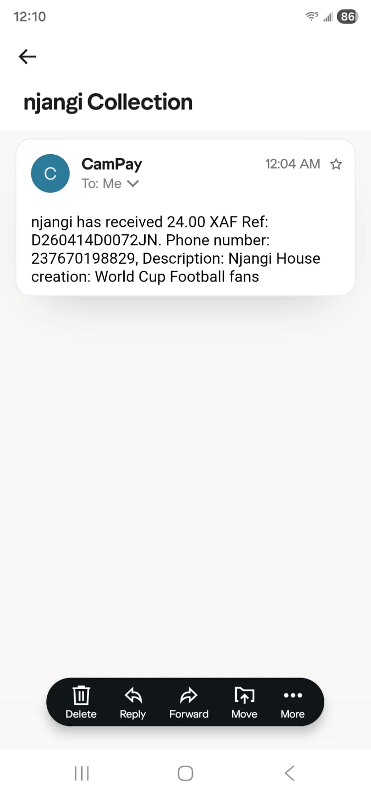 12:04 AM on 15 April 2026, Gulf Standard Time (UTC+4). The creator's phone received this email notification at midnight Dubai time — exactly the same instant as 21:04 Cameroon time (3-hour offset). CamPay confirmed receipt of 24 XAF after deducting a 1 XAF MTN network fee.